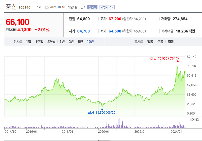 풍산에 대한 투자의견은 ‘매수’(BUY)로 유지되고 있으며, 목표주가는 80,000원입니다. 현재 주가는 64,800원 수준으로, 주가 상승 여력이 충분하다는 평가를 받고 있습니다. 특히, 방산 부문의 안정적인 성장은 장기적으로 풍산 주가에 긍정적인 영향을 미칠 것으로 예상됩니다.