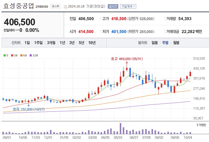 효성중공업(298040)의 주가 전망은 2024년 하반기부터 2025년까지 실적 개선과 함께 긍정적인 흐름을 보일 것으로 기대됩니다. 현재 주가는 406,500원으로, 목표주가인 520,000원까지 약 28%의 상승 여력이 있습니다. 특히, 중공업 부문의 두 자릿수 마진 회복과 해외 수주 확대가 주가 상승을 이끌 중요한 요소로 작용할 것입니다.