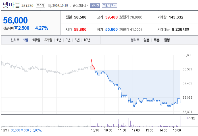 넷마블(251270)의 주가 전망은 2024년 신작들의 성과와 지속적인 흑자 전환이 주된 이슈로 부각되고 있습니다. 현재 넷마블 주가는 58,500원으로, 목표 주가인 68,000원 대비 약 16% 상승 여력이 남아 있습니다. 올해 출시된 여러 신작 중 일부가 기대에 미치지 못하면서 주가는 다소 조정받았지만, 향후 예정된 주요 게임의 성과가 주가 반등의 중요한 요소로 작용할 것입니다.
