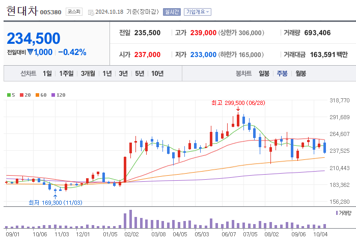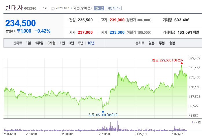 현대차(005380)의 주가 전망은 2024년 글로벌 자동차 시장에서의 성과와 HMI IPO의 성공 여부에 달려 있습니다. 현재 현대차 주가는 235,500원으로, 목표 주가인 370,000원까지 약 57%의 상승 여력이 존재합니다. 특히 인도 법인(HMI)의 IPO 성공은 향후 주가 상승의 주요한 촉매제가 될 것으로 기대됩니다.