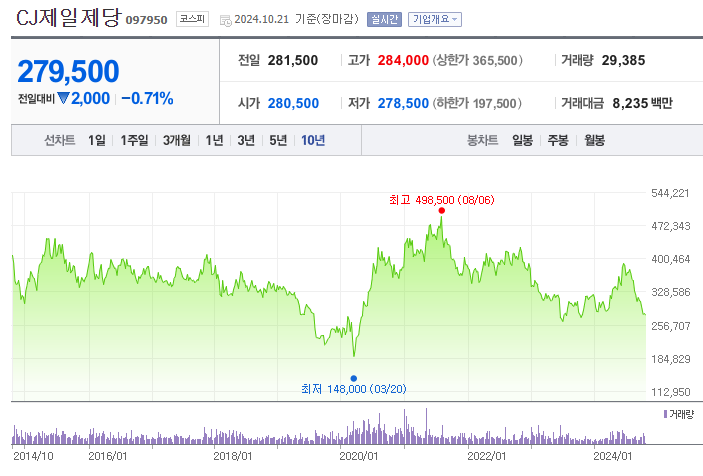 CJ제일제당(097950)의 주가 전망은 내수 소비 위축과 해외 수출 실적에 따라 변동될 가능성이 큽니다. 주가는 현재 281,500원 수준에서 형성되어 있으며, 목표 주가는 400,000원으로 하향 조정되었습니다. 이번 보고서에서는 CJ제일제당 주가와 관련된 주요 이슈들을 살펴봅니다.