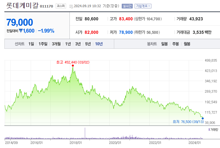 2024년 3분기 실적은 매출액 약 5.5조 원, 영업손실 약 1,341억 원, 지배주주 순손실 약 1,427억 원으로 예상됩니다. 이는 전분기 대비 적자폭이 확대된 수치로, 고가의 나프타 투입과 운송비 상승, 원/달러 환율 하락이 주요 원인으로 꼽힙니다. 하지만 유가 하락은 원가 절감의 주요 요소로 작용할 가능성이 있습니다. 주요 지표를 보면, 현재 시가총액은 3조 2,894억 원이며, 52주 최고가는 162,600원, 최저가는 76,900원입니다. 배당 수익률은 2.28%로 안정적인 배당을 제공하고 있으나, 주가의 하락세가 이어지며 투자자들의 신뢰는 다소 약화된 상태입니다.