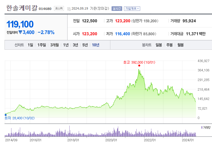 한솔케미칼의 현 주가는 2024년 예상 실적 기준 P/E 12.3배로, 이는 국내 반도체 소재 및 부품 업종의 평균인 13.8배를 하회하고 있습니다. 이는 북미 및 유럽 전기차 시장의 수요 둔화가 이차전지 소재 부문의 실적에 큰 영향을 미친 결과입니다. 전기차 시장의 회복 여부가 향후 주가의 중요한 변수로 작용할 것입니다. 동사는 이차전지 바인더 외에도 주력 배터리 셀 업체와 실리콘 음극재 평가를 진행 중이며, 2025년 본격 양산을 목표로 하고 있습니다. 또한 황화물계 고체전해질 파일럿 라인을 구축하여 완성차 업체와 함께 연구개발을 진행 중입니다. 다만, 북미 전기차 시장에 대한 정책 변화 가능성과 수요 전망의 변동성이 리스크로 작용할 수 있습니다.