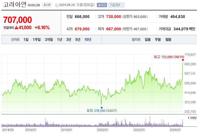 고려아연에 대한 투자의견은 'HOLD'로 유지되며, 목표 주가는 55만 원으로 상향되었습니다. 이는 2024년 예상 실적을 기반으로 한 PBR 1.2배 수준입니다. 2023년 자사주 매입과 높은 배당성향을 감안하면, 중장기적으로 안정적인 투자처로 볼 수 있습니다. 현재 주가(2024년 9월 5일 기준)는 53만 9천 원으로, 목표 주가 대비 상승 여력은 2%입니다. 주주환원 정책이 지속되며 장기적인 성장을 기대할 수 있지만, 단기적인 상승 여력은 크지 않을 것으로 보입니다.