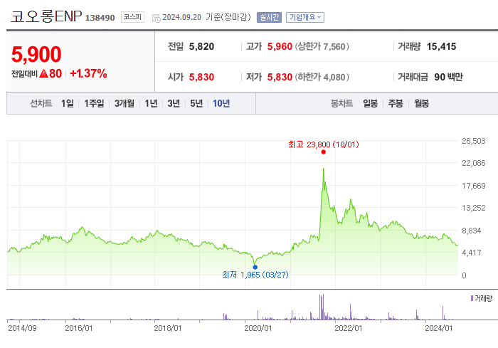 코오롱 ENP(138490)는 1996년 3월에 설립된 엔지니어링 플라스틱 제조 전문 기업으로, 2011년 6월에 상장되었습니다. 이 회사는 고부가가치 엔지니어링 플라스틱을 개발하고 다양한 산업에 공급하고 있습니다. 자동차, 전기전자, 의료기기 등 다양한 산업에서 그 수요가 증가하고 있으며, 코오롱 ENP는 이를 선도하고 있습니다.