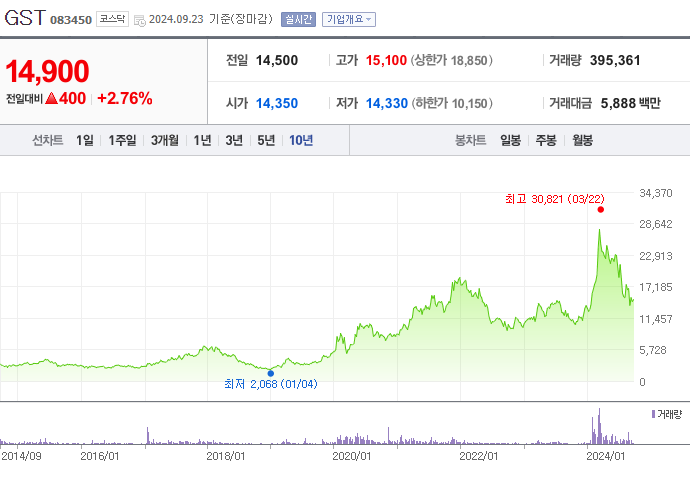 GST에 대한 목표주가는 25,000원으로 설정되었습니다. 이는 현재 주가(14,500원) 대비 약 72%의 상승 여력을 나타냅니다. 액침냉각 기술의 확대와 해외 고객사 확보가 주가 상승의 주요 요인으로 작용할 것입니다