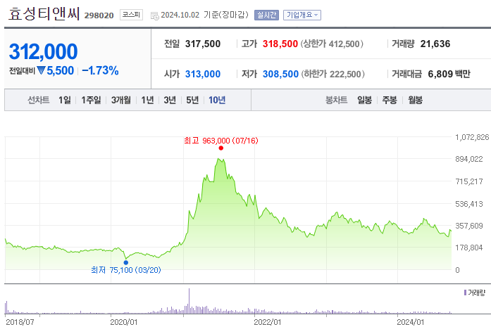 효성티앤씨는 글로벌 스판덱스 시장에서 확고한 입지를 가지고 있으며, 장기적으로는 스판덱스 시장의 회복과 함께 안정적인 성장을 이어갈 것으로 기대됩니다. 2024년 이후 스판덱스 가격의 회복과 글로벌 수요 증가에 따라 회사의 매출과 영업이익이 점진적으로 상승할 가능성이 큽니다.