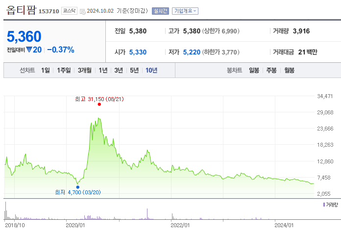 옵티팜은 동물질병 진단과 치료 솔루션을 제공하는 전문 기업으로, 동물 진단 및 약품 개발에서 강력한 기술력을 보유하고 있습니다. 2000년에 설립된 이 기업은 2018년 코스닥 시장에 상장되었으며, 주로 동물 질병 예방 및 진단 제품을 개발하여 동물 건강 관리에 기여하고 있습니다. 특히, 박테리오파지 기반의 사료첨가제와 다양한 동물 질병 진단 서비스를 제공하며, 농장과 연구기관에서 높은 신뢰를 받고 있습니다. 최근에는 이종장기 연구와 VLP 백신 개발을 통해 새로운 성장 동력을 확보하고 있습니다.