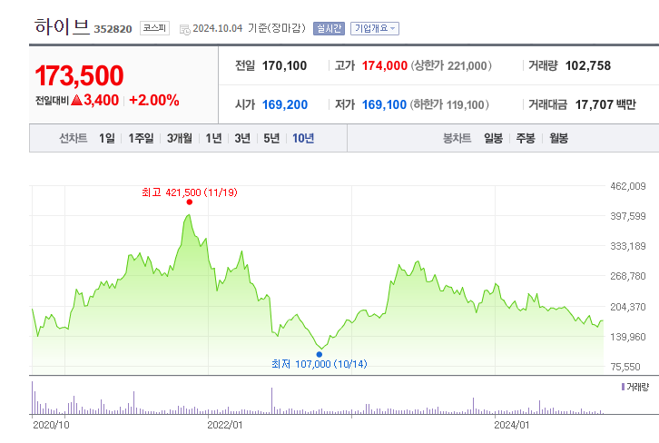 하이브는 2024년 3분기에도 K-POP 업계에서 주목할 만한 성과를 이어가고 있습니다. 주가는 현재 170,100원으로 52주 최고가 대비 다소 하락한 상태이지만, 4분기와 내년 상반기의 아티스트 활동 계획을 감안하면 회복 가능성이 높습니다. 특히, BTS의 복귀 시점이 2025년 하반기로 예상되며, 이에 따른 대규모 콘서트와 앨범 판매가 하이브의 매출을 크게 견인할 것으로 기대됩니다.