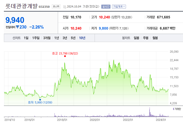 롯데관광개발(032350)은 2024년 3분기에도 제주 복합리조트와 카지노 사업에서 견조한 성과를 이어가고 있습니다. 현재 주가는 13,000원이며, 52주 최고가 대비 다소 하락한 상황이지만, 3분기 실적에서 매출 352억 원(전년 동기 대비 +58.4%)을 기록하며 긍정적인 흐름을 보여주고 있습니다. 카지노 사업에서의 매출 성장과 중국 및 일본 VIP 고객의 유입이 실적을 견인했습니다.