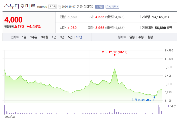 스튜디오미르는 애니메이션 제작 전문기업으로, 주로 글로벌 OTT 플랫폼을 통해 다양한 프로젝트를 진행하며, 최근 토에이 애니메이션과 협약을 체결하여 IP 사업 확장을 본격화하고 있습니다. 현재 주가는 3,830원이며, 시가총액은 약 1,330억 원입니다. 52주 최고가는 10,110원, 최저가는 2,330원으로 변동성이 매우 큽니다.