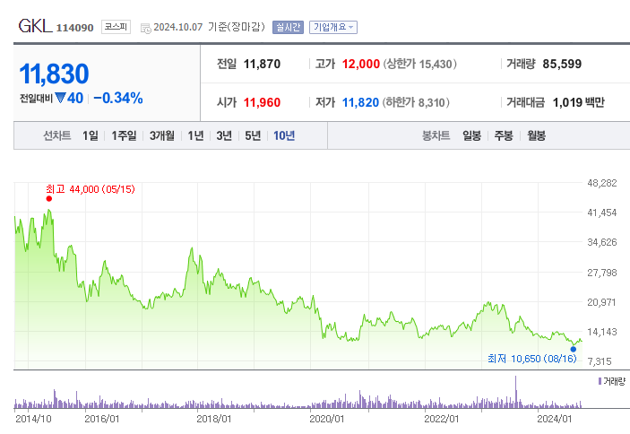 GKL은 한국관광공사 자회사로, 외국인 전용 카지노를 운영하며 강남과 부산, 드래곤시티에 카지노를 보유하고 있습니다. 현재 주가는 11,870원이며, 시가총액은 약 7,342억 원입니다. 52주 최고가는 15,780원, 최저가는 10,750원으로 최근 주가 변동폭이 큽니다.