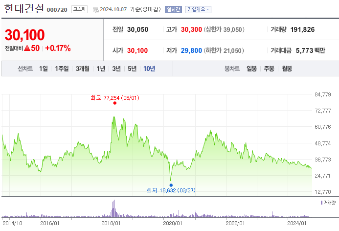 현대건설은 건축, 주택, 플랜트, 토목 등 다양한 사업 부문을 운영하는 한국의 대표적인 건설사입니다. 현재 주가는 30,050원이며, 시가총액은 약 3조 3,460억 원입니다. 52주 최고가는 37,450원, 최저가는 29,650원으로, 주가 변동성이 높습니다.