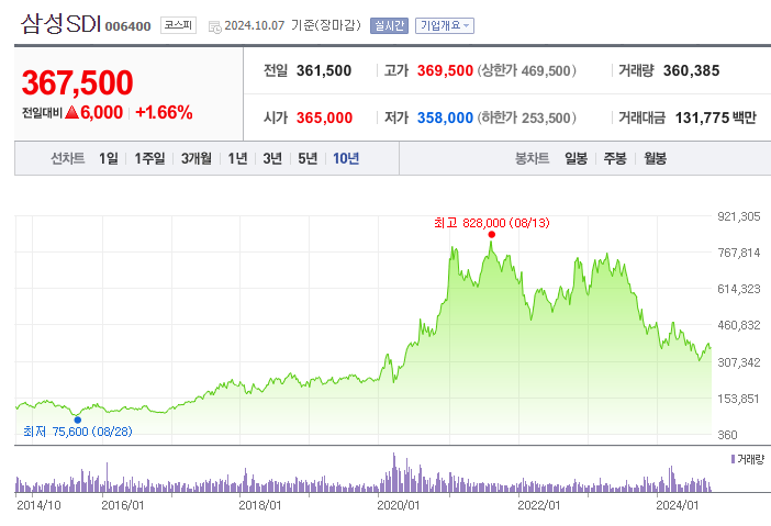 삼성SDI는 전기차 배터리 및 에너지 저장 장치(ESS)를 포함한 다양한 전지 솔루션을 제공하는 글로벌 선도 기업입니다. 현재 주가는 361,500원이며, 시가총액은 약 252,200억 원입니다. 52주 최고가는 535,000원, 최저가는 303,000원으로, 주가는 최근 변동성이 큰 상태입니다.