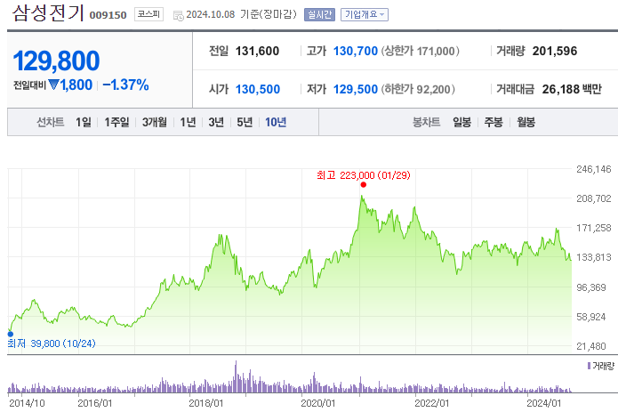 삼성전기의 현재 주가는 160,000원으로, 시장의 기대에 부합하는 안정적인 실적을 보여주고 있습니다. 2024년 3분기 매출은 1.9조원, 영업이익은 2,250억원으로 예상되며, 이는 전년 동기 대비 12% 상승한 수치입니다. 삼성전기는 특히 전장용 MLCC와 5G 안테나 모듈 수요가 증가하며 전반적인 매출 성장을 견인하고 있습니다. 이와 같은 실적 성장은 삼성전기가 글로벌 부품 시장에서의 경쟁력을 강화하고, 장기적인 성장을 도모할 수 있는 기반이 됩니다.