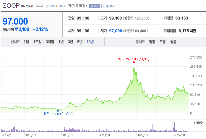 안녕하세요 오늘은 SOOP 주식에 대해 정리하며, 장 단기 투자 전략을 세워보도록 하겠습니다.