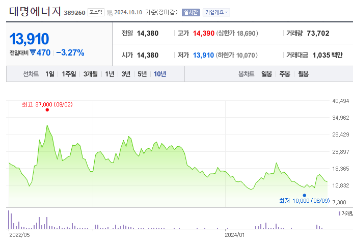 대명에너지의 주가도 신재생에너지 프로젝트의 진행 상황에 큰 영향을 받습니다. 예를 들어, 2024년 10월 현재 주가는 14,380원으로, 금리 인하와 국내 정책적 지원에 힘입어 향후 신재생에너지 관련 매출이 증가할 것으로 전망됩니다.