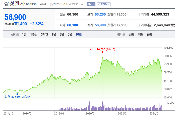 삼성전자는 2024년 3분기 매출이 전년 동기 대비 6.5% 증가한 79조 원을 기록했으며, 영업이익은 9.1조 원으로 소폭 감소했습니다. 특히 반도체(DS) 부문이 출하 및 가격 부진으로 예상보다 저조한 실적을 보였습니다. 반면, 디스플레이 부문은 전 분기 대비 개선되었으나 여전히 작년과 비교하면 낮은 수준입니다. 삼성전자 주가는 이러한 실적 변동에 영향을 받으며 현재 60,300원으로 52주 최저가를 기록하고 있어 매수 기회를 제공할 수 있습니다.