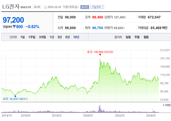 LG전자의 주가는 2024년 10월 현재 98,000원으로 거래되고 있으며, 현재의 실적을 반영해 다소 부진한 주가 흐름을 보이고 있습니다. 이는 LG전자가 글로벌 가전 시장과 전기차 시장에서의 수요 둔화를 겪고 있기 때문입니다.