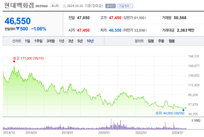 현대백화점은 2024년 3분기 예상 매출 9,929억 원, 영업이익 643억 원으로 전년 동기 대비 각각 1%와 13% 감소가 예상됩니다. 부산점 리뉴얼과 신촌, 미아 등의 중소 점포 부진이 원인이며, 명품과 패션 판매도 전반적으로 하락했습니다. 이로 인해 백화점 부문의 영업이익은 전년 대비 6% 하락할 것으로 보입니다. 현재 현대백화점의 주가는 47,050원으로, 연중 최저가에 근접한 상태입니다. 본업의 부진이 주가 하락의 주요 원인 중 하나이며, 향후 매출 회복이 필요한 상황입니다.