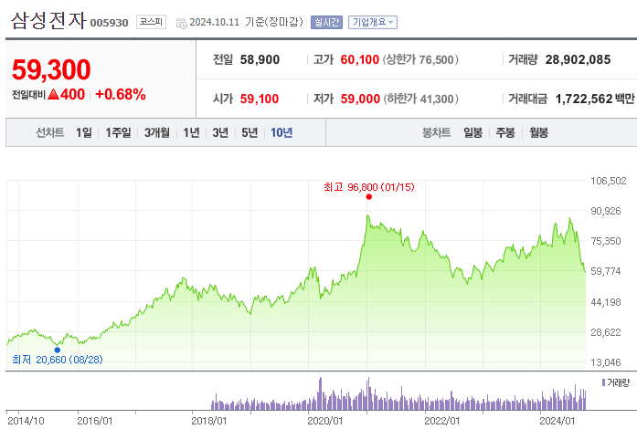 삼성전자의 2024년 3분기 매출은 79조 원이며, 영업이익은 9.1조 원으로 컨센서스인 10.7조 원을 크게 하회했습니다. 현재 주가는 60,300원으로 목표 주가 100,000원에 비해 약 66% 상승 여력이 있습니다.