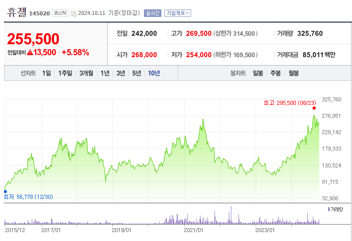 미국과 중국 시장에서 톡신과 필러 제품의 수출이 본격화되면서 휴젤 주가는 중장기적으로 상승할 가능성이 높습니다. 특히, 소송 종료로 인해 밸류에이션이 재평가될 여지가 있으며, 이에 따라 휴젤 주가 전망도 매우 긍정적으로 평가됩니다. 장기적으로 안정성과 성장성을 겸비한 종목으로, 투자 매력도가 높은 종목으로 판단됩니다.