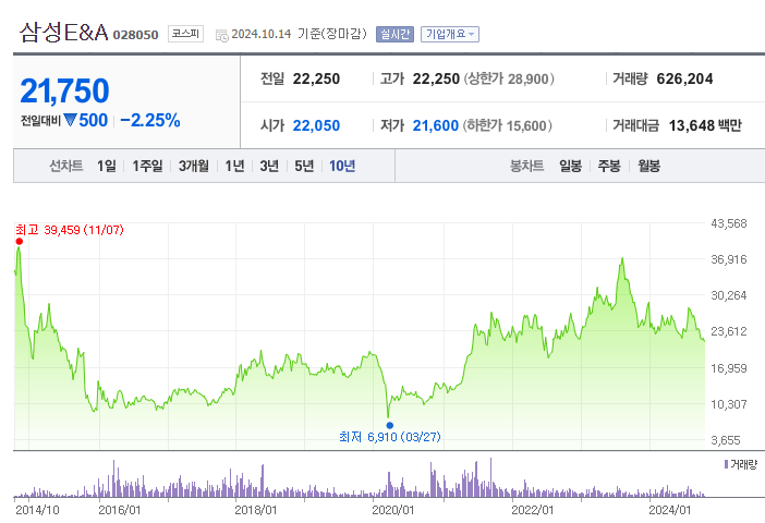 삼성 E&A의 주가는 최근 변동성 확대와 함께 하향 안정화 경향을 보이고 있습니다. 이는 주로 건설과 비화공 부문 실적의 불확실성에 기인하며, 예상보다 낮은 수익률을 기록하고 있습니다. 2024년 주가는 상반기 호실적에도 불구하고 지속적인 수주 부재로 인해 하락세를 면치 못하고 있으며, 현재 주가는 22,250원 수준으로 거래되고 있습니다.