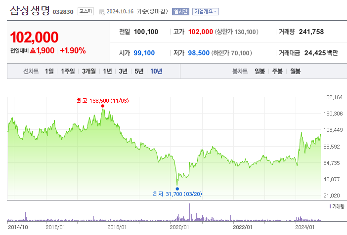 삼성생명은 2024년 목표 배당 수익률을 5.4%로 설정하며 주주 환원을 강화할 계획입니다. 이는 약 10조 원의 배당 가능 이익을 보유한 삼성생명의 자본 여력을 반영한 것으로, 주가 전망에 긍정적인 영향을 미칠 수 있습니다. 다만, 삼성전자 주가와 금리 변동성으로 인해 보험업종 전반에 대한 투자 심리가 약화되었으나, 삼성생명은 이를 상쇄할 수 있는 주주 환원 정책을 통해 안정적인 주가 유지를 목표로 하고 있습니다.